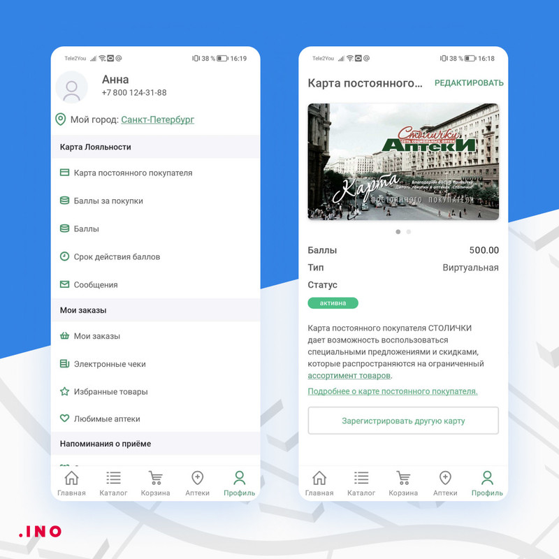Разработка приложения для сети аптек проводилась с целью увеличения уровня лояльности клиентов. С помощью личного кабинета пользователи имеют возможность отслеживать статус своих заказов, добавлять интересующие препараты в раздел «Избранное», активировать карту постоянного покупателя и просматривать количество накопленных бонусных баллов.