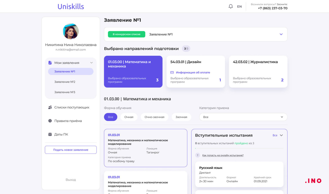 Платформа для абитуриентов создана с целью обеспечить возможность подачи заявлений в вузы онлайн без необходимости личного присутствия. Информация представлена в форме удобной панели управления, которая отображает все необходимые данные, включая статус выбранных образовательных программ, информацию о вступительных испытаниях и список абитуриентов с их баллами. В персональном кабинете будут доступны подсказки для пользователей, а также возможность связаться с чат-ботом в случае возникновения срочных вопросов.